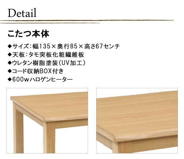 暖卓サイズ:幅135×奥行85×高さ67センチ ■天板:タモ突板化粧繊維板 ウレタン樹脂塗装 ●600Wハロゲンヒーター 手元電子コントローラー(MHU-601E) 肘付椅子サイズ:幅50×奥行59.5×高さ77.5×座面高40センチ ■構造部材:天然木ラバーウッド 張り生地:合成皮革(PVC) 回転式 キャスター付 ※こちらの商品はご注文いただいてから1日〜2日(土日除く)での発送となります ◇このシリーズには 「こたつ135+肘付椅子4脚+掛け布団の6点セット」、「こたつ135+肘付椅子4脚の5点セット」 「こたつ135+肘無し椅子4脚+掛け布団の6点セット」、「こたつ135+肘無し椅子4脚の5点セット」 の販売がございます。